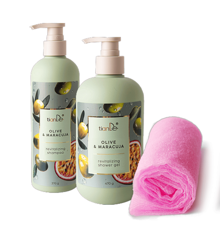 Pirk 2 priemones “Alyvuogės ir pasiflorai“: gaivinantį šampūną + dušo želę PADOVANOSIME japonišką kempinę – kūno rankšluostį!