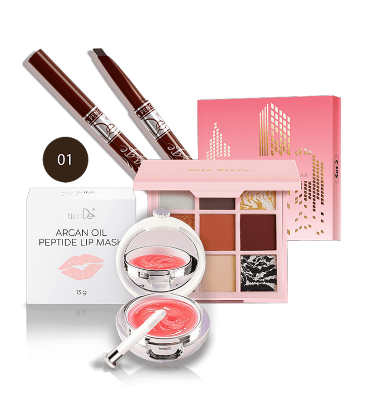 Pirk 2 priemones: peptidų kaukę lūpoms su arganų aliejumi + antakių pieštuką (tonas 01) - PADOVANOSIME akių šešėlius “Makiažo idėjos” (2 rinkinys)