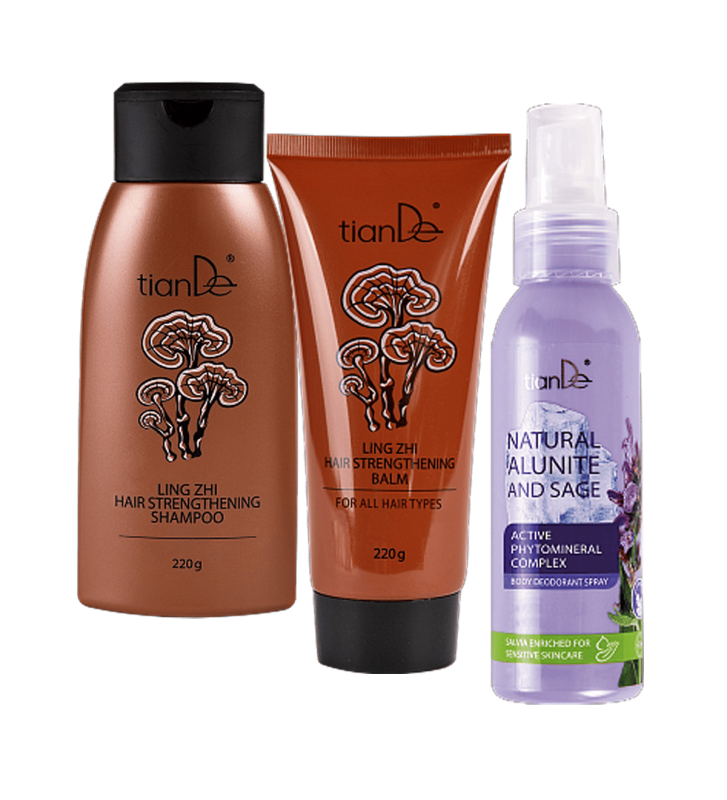 Pirk 2 priemones: plaukų šaknis stiprinantį šampūną su Ling Zhi ekstraktu + šaknis stiprinantį balzamą plaukams su Ling Zhi grybo ekstraktu - PADOVANOSIME purškiamą kūno dezodorantą “Gamtinis alunitas ir šalavijas”!